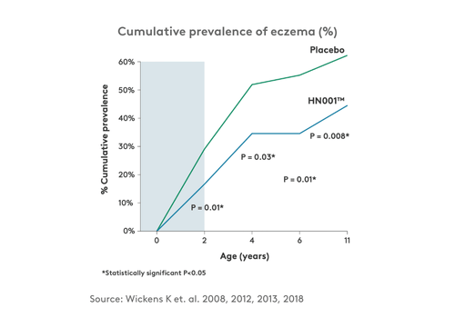Nearly 50% reduction in the development of eczema symptoms at 2 years of age compared to placebo group in clinical trial¹.