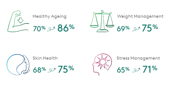 Brands have the opportunity to bridge this "perception gap" by prioritizing evidence-based knowledge to guide consumers' purchasing decisions and enhance consumer confidence. Health concerns such as immunity, sleep quality, and digestive/intestinal health remain top priorities for Chinese consumers. There has also been a growing emphasis on weight, stress, aging, and skin health since 2021.