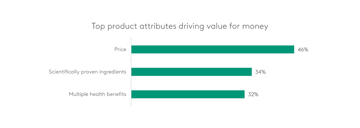 What shapes your perceptions of value when purchasing nutritional products to manage your health and wellbeing? 32% of consumers answer, “Multiple health benefits”, with 51% displaying a consistent inclination towards such solutions.