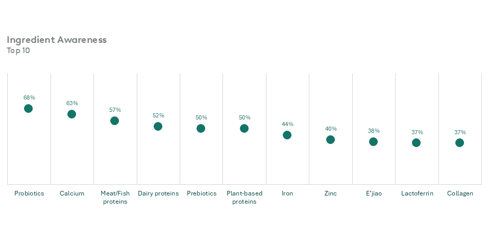 Probiotics, calcium, protein, and prebiotics are well-known ingredients, and Chinese consumers are becoming increasingly aware of their beneficial health effects. It is also recommended that health and nutrition brands take advantage of Chinese consumers' high awareness of dairy ingredients to combine the above-mentioned nutrients with dairy products.